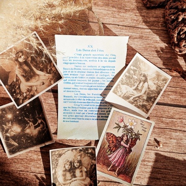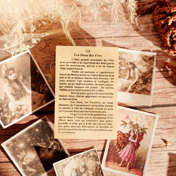 Fragmento en francés inspirado en un cuento del siglo XIX, donde las Hadas se reúnen para repartir los dones a los recién nacidos. Su tipografía antigua y disposición de texto transmiten ceremonia, misterio y promesa: la alegría y la prueba como dos caras del mismo encantamiento. Más que leerse palabra por palabra, funciona como velo poético, capaz de transformar cualquier página en un ritual de papel.