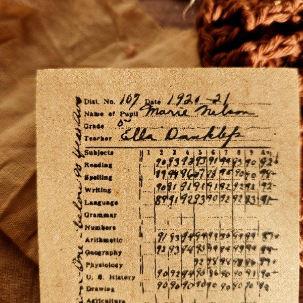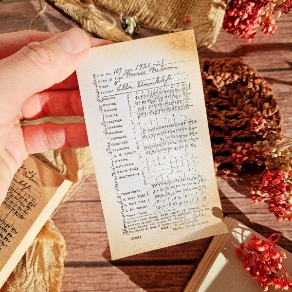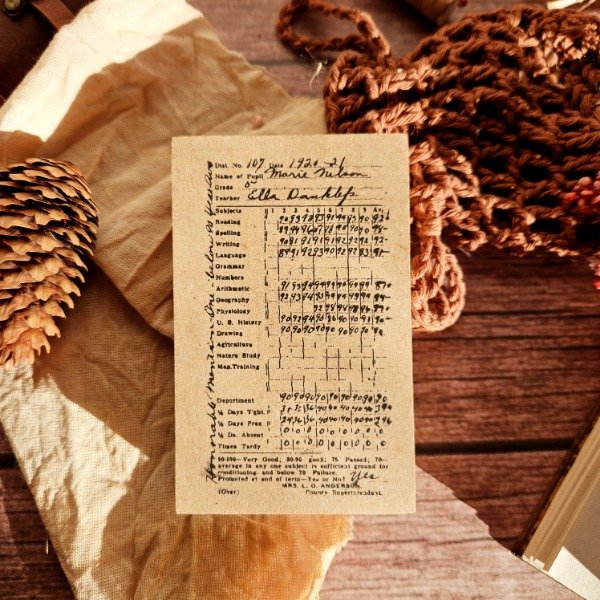Una tabla escolar manuscrita con fechas y calificaciones, como salida de un cuaderno de clase antiguo. Aporta orden visual, margen y nostalgia sin pedir completar nada: es pura atmósfera de aula, tinta y papel. En sepia, negro o azul noche queda precioso sobre papeles marfil, kraft o papel vegetal como velo.