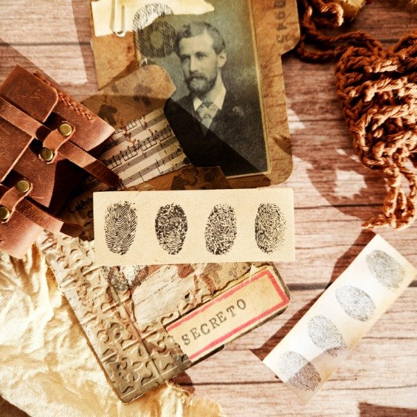 Cuatro huellas definidas, estilo ficha policial antigua. Un gesto humano antiguo que vuelve íntima cualquier página de tu cuaderno; suma textura potente en tintas oscuras y también como sombra en gris