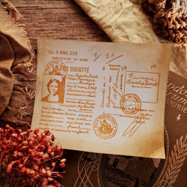 Sello de calidad internacional, documento con retrato, sellos y escritura a pluma. Equilibra intimidad y misterio, perfecto para escenas de archivo, páginas románticas o collages con velo de papel madera